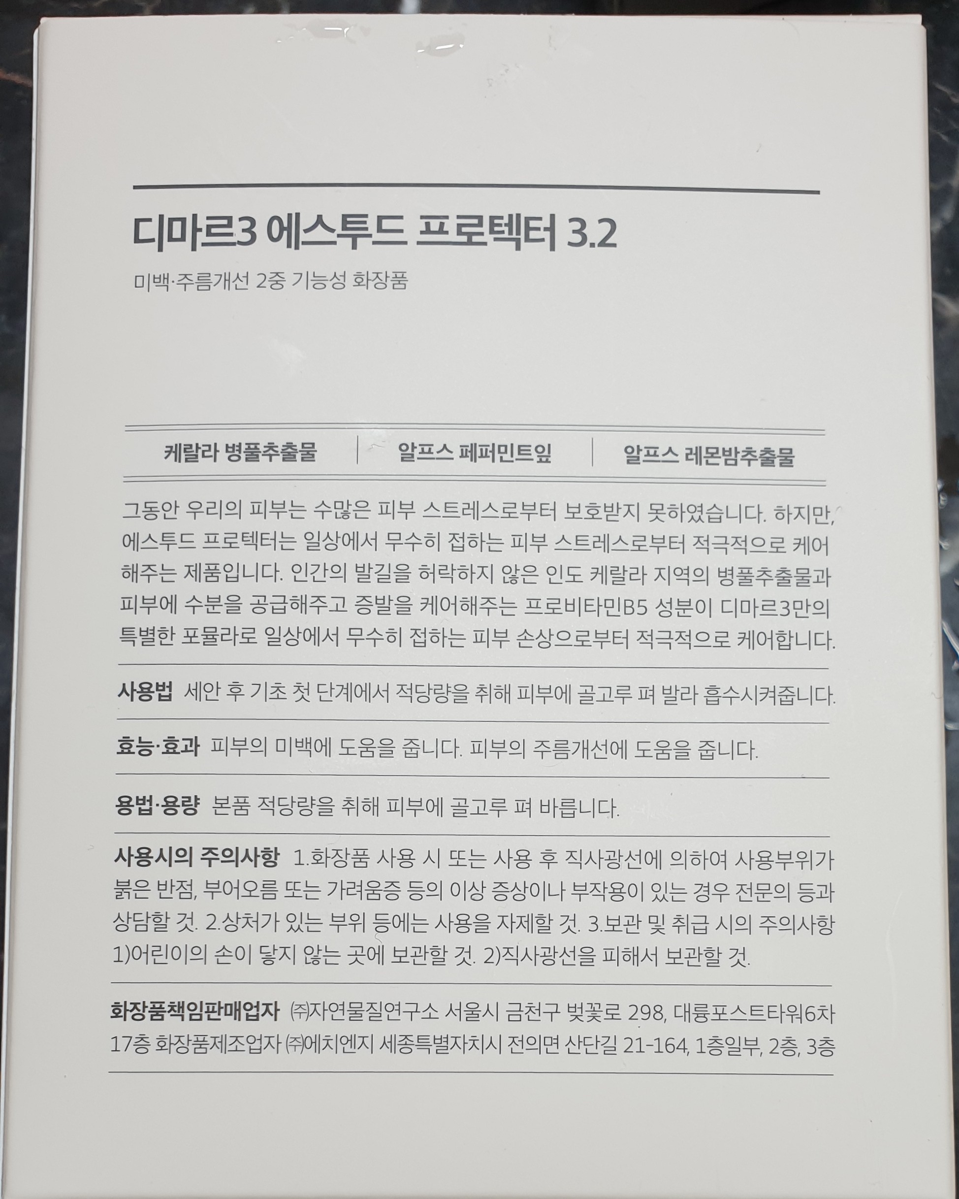화장품책임판매업자 주)자연물질연구소 서울시 금천구 벚꽃로 298, 대륭포스트타워6차 17층 화장품제조업자 주에치엔지 세종특별자치시 전의면 산단길 21-164, 1층일부, 2층, 3층